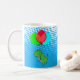 Belle bande dessinée bébé t-rex volant dans le ciel bleu avec des ballons. Des tasses à café personnalisées pour bébé animal. Idée cadeau pour les enfants qui aiment les dinosaures.