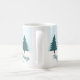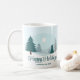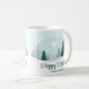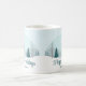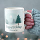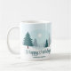 Un magnifique paysage hivernal avec pins verts turquoises et terrain couvert de neige sur des tasses de vacances personnalisées. Customisez ces tasses Happy Holidays avec votre propre nom ou compagnie.