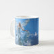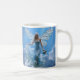 Une belle fée aux cheveux argentés avec des ailes irisées et une robe bleue claire flottante au-dessus des nuages contre un ciel bleu tout en versant de l'eau d'un lanceur. Elle représente Aquarius, le porteur d'eau.
