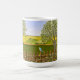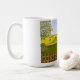 Un mug avec une belle image d'une scène naturelle : un oiseau perché sur une clôture patinée, des fleurs sauvages poussant autour de la clôture, un agriculteur sur un tracteur, travaillant sa terre, des arbres avec des feuilles et des terres agricoles aux couleurs variées. Le fond et l'image peuvent être personnalisés. Du texte peut être ajouté. Œuvre originale de W.B.