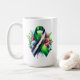 Coffee mug to help spread awareness for Bipolar Disorder with a black, white and green striped awareness ribbon and flowers. An inspirational quote with the words, "Hope is stronger than the storm..”