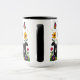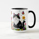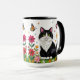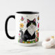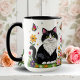 A sweet coffee cup with a cute illustration of a black and white cat surrounded by flowers and butterflies in a paper quilling impasto style.