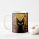 A cute black cat with large yellow eyes and red roses on a gold and brown mott;ed background