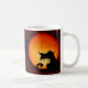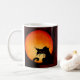 Scary chat noir avec les yeux orange devant une grande lune orange, pleine.