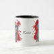 Un beau portrait couleur eau d'un Labrador Retriever noir se distingue par un arrière - plan abstrait de peinture rouge vif. L'image est sur deux côtés de la tasse, avec votre nom ou autre texte personnalisé en noir entre eux.