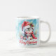 Cette tasse à café personnalisée en bleu et rouge festif présente le dicton "Joyeux Noël" et le modèle du nom de famille décoré d'un mignon pingouin assis avec une minuscule illustration de bonhomme de neige sur un arrière - plan bleu neigeux.