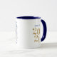 Cette tasse de graduation photo présente des flores d'aquarelle bleu et blanc sur le devant et Classe de 2021 dans une parties scintillant en faux or sur le dos. L'avant a un endroit à personnaliser avec un nom sur un nuage d'aquarelle. Il y a un faux accent de confetti doré près du nom.