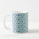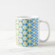 Cette tasse joyeuse présente un motif progressiste lumineux en bleu, jaune et vert. Les couleurs motifs vives enveloppent la tasse, vous donnant des motifs intéressants à méditer avec votre boisson. Les motifs comprennent des fleurs à six pétales, des étoiles, des diamants et des peignes de miel.