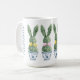 This Easter ceramic mug features cute bunny rabbit green topiaries with pink and yellow bows in blue and white chinoiserie flowerpots. Personalize with your choice of name or special holiday message. Great for Easter baskets and gift bags.