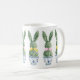 This Easter ceramic mug features cute bunny rabbit green topiaries with pink and yellow bows in blue and white chinoiserie flowerpots. Personalize with your choice of name or special holiday message. Great for Easter baskets and gift bags.