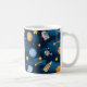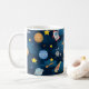 A whimsical and colorful seamless pattern featuring adorable watercolor illustrations of celestial objects on a dark blue night sky background with soft cloud effects. The design includes happy planets, rockets, a UFO, shooting stars, and asteroids, making it perfect for children's decor, apparel, fabric, accessories, and other print-on-demand items. This design is great for space lovers of all ages.
