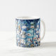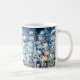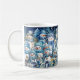 This festive mug features a cheerful pattern of snowmen and Christmas presents, playfully arranged on a serene blue background, perfect for sipping your favorite holiday beverages.