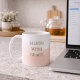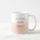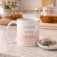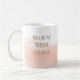 “Bloom With Grace” displayed in taupe serif lettering over a wraparound blush watercolor wash on a white base. Designed for desks, kitchen counters, or morning routines, this mug adds soft color layering and refined typography to everyday drinkware use.