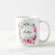 Boho Aquarelle Peonas Rose Fleur Wreath Mug Personnalisé | Tasse personnalisable à l'aquarelle avec couronne florale de pivoines roses et roses roses roses, plumes, cristaux, flèches et feuillage. Cette tasse florale de saumons boho sera parfaite comme cadeau personnalisé.