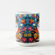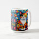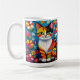 A cute cat themed coffee mug. A cute colorful boho cat sitting in flowers and surrounded by butterflies. The art is in an impasto oil paper quilling style.