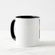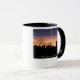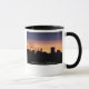 Un lever de soleil de matin au-dessus de la ville de Baltimore sur une tasse blanche avec l'équilibre noir sur la poignée et la jante.