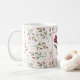 Une tasse avec un cadre carré et une bordure rose, à l'intérieur il dit "Hello Beautiful" écrit dans une police tendance avec un soleil jaune gribouillé au-dessus du texte. Aussi une jolie fleur rose, longue tige avec des feuilles verts sur le côté. La toile de fond est un motif sans couture avec des fleurs sauvages roses dessinés à la main avec de longues tiges vertes et des feuilles sur un arrière - plan blanc en coquille d'oeuf. Des cercles roses et des sprigs décorent également le design. Joli design floral et mignon.