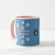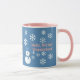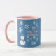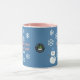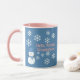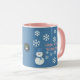 A Slice of Life and Delight présente Hello, Winter Wonderland des tasses à café combo avec un bonhomme de neige décoré de flocons de neige blancs, écriture rose, et un fond bleu. Les tasses à café bonhomme de neige ont également un casquette bleu et une écharpe.