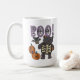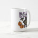 Cette tasse à café à thème Halloween est parfaite pour boire un café citrouille épice ou n'importe quel poison que vous préférez. Il affiche le slogan "BOO !" en lettres de couleur lavande ornées de toiles d'araignée, ainsi qu'une illustration de chat animal farci et de chauve-souris et quelques citrouilles assortis. Le chat et la chauve-souris gris charbon ont des petits yeux patchés, des boutons et des squelettes visibles sur leur ventre pour un look éffrayant, mais adorable. Le design apparaît de part et d'autre de cette tasse qui est parfaite pour la gauche comme pour la droite.