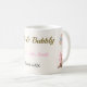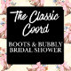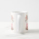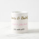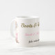 The Boots and Bubbly bridal shower coffee mug is designed with brown cowgirl boots, a pink bow, colorful flowers, pink, brown, and black text, and a tan background.