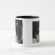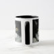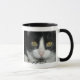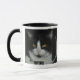 Tasse noire et blanche de chat avec la jante et la poignée noires.