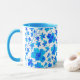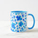 Mug in a watercolor-style floral pattern with flowers in shades of deep blue on a white background. Large, detailed blossoms alongside smaller, simpler flowers and delicate branching stems, for an airy, botanical feel.
