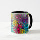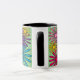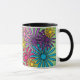 Cette tasse a un design Bauhaus d'un mélange de fleurs en rose, violet, bleu et jaune sur un champ de vert.