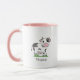 Une tasse drôle avec une poignée rose et une jolie vache en style Dessin. Ce design est adapté si vous cherchez un cadeau à un fermier ou une fille qui aime les animaux de Kawaii! Customisez-le avec le nom de votre ami.