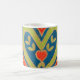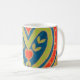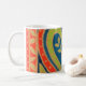 Une tasse à café blanche avec un design de coeur décoratif en rouge, bleu, vert et or d'une aquarelle de Judy Adamson.