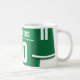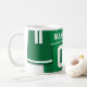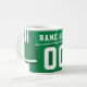 Facile à éditer chemise de football / maillot de football, le design sur la tasse est dans le style d'une chemise de football, avec manches et rayures. Il suffit d'utiliser les cases à droite de l'image pour insérer votre propre choix de nom et de numéro. Ce design de jersey est en vert avec des rayures et des garnitures blanches. Cadeaux de maillot de sport personnalisés uniques pour les amateurs de sport et les joueurs de votre vie!