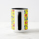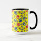 Une Mug blanche avec une lèvre et une poignée noires et un motif de choux mignons en rouge, bleu, vert sur un arrière - plan jaune, que vous pouvez facilement changer en utilisant le bouton d'édition. Le motif de hibou était un collage original peint à la main par Judy Adamson.