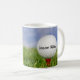 Gros plan de balle de golf blanche sur tee rouge dans l'herbe avec nom customisé.