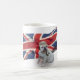Montrée est une image photographique d'un bouledogue anglais blanc utilisant un casquette de chasseur de cerf et avec un tuyau de calebasse (inspiré par Shirlock Holmes) devant un drapeau britannique.