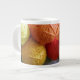 Boules de fils en quatre couleurs (orange, rouge-orange, jaune foncé, jaune pâle). Une tasse de thé se marie toujours bien avec le travail des aiguilles.