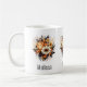 Une tasse avec un bouquet de fleurs élégant mais gothique. Composé de tulipes oranges, marguerites jaunes, feuilles et sprigs gris et quelques accents de baies oranges.