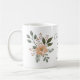 Cette tasse chrétienne possède un élégant bouquet floral de pêches et de fleurs et baies violettes légères contre un arrière - plan blanc, et un verset biblique (Éphésiens 6:10) : Soyez forts dans le Seigneur.
