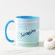 Belle tasse d'été aux rayures d'aqua abstraites, parsemée de vert clair et de rose. Personnalisez le nom du destinataire dans cette police amusante - fractionnée en diagonale sur la toile pour le panache.