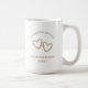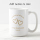 Ajoutez les noms et la photo du couple à cette tasse élégante d'anniversaire de mariage de 50 ans en or. La police simple et moderne de couleur bronzée dorée n'est pas une véritable feuille d'or mais un effet doré. Toute la typographie élégante est modifiable. Personnalisez ce souvenir photo spécial avec les noms du couple et la date d'anniversaire de mariage pour un beau cadeau d'anniversaire de mariage. "Célébrer 50 ans" peut être personnalisé pour n'importe quel nombre pour un 60ème, 40ème, 25ème anniversaire ou toute autre année. J'ai créé ces cœurs dessinés à la main pour votre cadeau d'anniversaire de mariage de 50 ans. Les deux cœurs uniques de couleur cuivrée dorée créés avec des empreintes de feuilles et de bourgeons ajoutent une touche botanique romantique. Ce serait un excellent cadeau pour une fête d'anniversaire de 50 ans dorée. La table aurait fière allure avec ces tasses comm