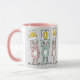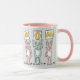 Fun Mug pour maman. Fun Rabbit Design Pink and White Mug avec l'illustration de Rabbits en rose et bleu. Mug cadeau de la Fête des Mères. De mignons lapins bébés. Les lapins tiennent des cartes pour épeler le mot MOM.