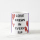 "L'amour brasse dans chaque gorgée" symbolise l'idée que l'amour, comme le café, est quelque chose à savourer et à apprécier lentement. Chaque gorgée représente un moment de connexion et de chaleur, tout comme les petits moments significatifs d'une relation. Tout comme le café revigore et le confort, l'amour apporte énergie et confort à nos vies. La citation capture l'essence de l'amour étant une présence constante et délicieuse dans nos routines quotidiennes.