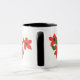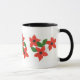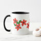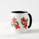 Une tasse à café blanche design avec une jante noire et une poignée et des bouquets de fleurs rouges, d'un collage en papier peint à la main par Judy Adamson.