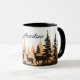 Cette tasse de café en céramique est montrée avec un imprimé d'art de cerfs dans la forêt avec le texte de Yellowstone. Intérieur et poignée noirs. Customisez cet objet ou achetez tel quel.