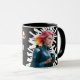 Café parce que l'adultère est une tasse dure L'image montre une femme futuriste et rebelle avec des cheveux rayés de néon, portant une veste métallique, tenant une tasse de café brillante. L'arrière - plan est un brin sombre et abstrait de lignes blanches, ajoutant un sentiment de mouvement ou d'impact. Sur la gauche, le texte en néon gras dit : "Café : parce que l'adultère est dur", dans un style de police manuscrit ludique, brillant doucement contre l'arrière - plan noir.