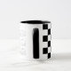Une tasse élégante présente un calendrier noir 2026 d'un côté et de l'autre, un motif à damiers noir et blanc audacieux composé de rangées alternant carrés blancs et noirs comme sur un drapeau de course. La tasse a une poignée noire et l'intérieur que vous pouvez customiser dans l'encadré. Copyright ©Claire E. Skinner. Tous droits réservés.