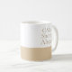 Calm Shores Ahead appears in serif lettering above a sand-beige horizontal band on a white ceramic surface. Inspired by beech-toned neutrals, the clean layout suits morning routines, desk breaks, and quiet kitchen shelves where soft color and structured design feel intentional.