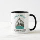 "Camp More Stress Less" déclare cette chemise pour la personne extérieure. Au centre se trouve une tente solitaire entourée de forêts et de montagnes. Les couleurs utilisées sont le gris, le bleu turquoise, le marron et le blanc. L'image est imprimée sur deux côtés, avec des champs pour votre monogramme de trois lettres au centre entre eux.