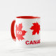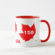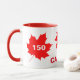 Trois feuilles d'érable rouge volent au vent d'automne. Numéro 150 dans les feuilles gauche et droite. Parole rouge Canada sous la feuille médiane. Élégante tasse à café rouge et blanc pour célébrer le 150e anniversaire du Canada. Personnalisable . Vous pouvez modifier le style de la tasse et vous pouvez modifier ou supprimer les images et les textes pour personnaliser le produit. Amuse-toi bien !