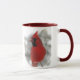 Images retournées de cette caractéristique de tasse d'un cardinal rouge brillant. Il est vraiment le roi des oiseaux de jardin ! Le voici qui est été perché sur un rail neigeux mangeant les graines de tournesol noires d'huile tandis que la neige d'hiver tourbillonne autour de lui.