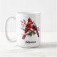 Profitez de votre boisson chaude préférée avec cette belle tasse cardinale en couple, avec une illustration éclatante de style aquarelle de deux cardinaux rouges perchés sur une branche de pin enneigé avec des baies d'hiver. Symbole de l'amour, de l'espoir et de souvenirs chéris, les cardinaux rendent ce design particulièrement significatif. Personnalisez avec un nom pour un cadeau réfléchi et pratique, parfait pour les amateurs d'oiseaux, les réunions de vacances, ou toute personne qui apprécie la beauté de la nature dans leur routine quotidienne.