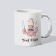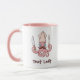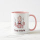 Caricature du chef calmar rose avec moustache tenant couteau et fourche à cuisine. Texte personnalisé des deux côtés.